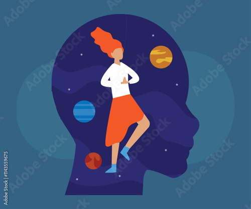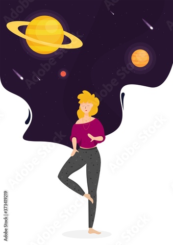 Young woman sleeping at night and cute pet dog sleeping at her feet on the bed, flat vector illustration. Starry night sky background. Sweet dream.