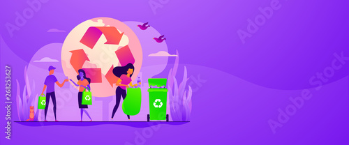 Man and woman holding planet globe with recycle symbol, tiny people sorting waste, using eco shopping bag, reusable cup, vector flat illustration. Zero waste green eco friendly lifestyle, ecology.