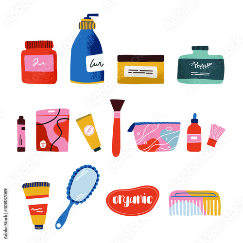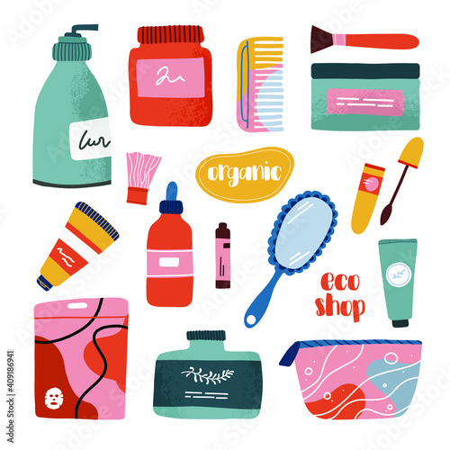 Zero waste tips and eco friendly reusable glass bottle, jar, cloth shopping bag, natural food, soap, vector flat illustration isolated on white background. Life without plastic, waste sorting concept.