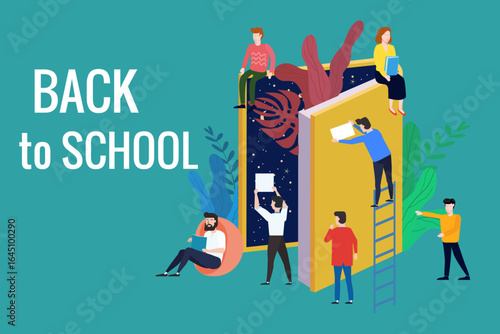 Huge metal water bottle, micro characters with reusable grocery bags and globe, vector illustration. Zero waste, no plastic, save planet concept for web banner, website page etc.