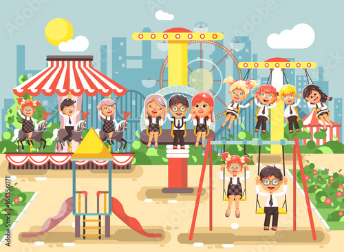 Zoo animals vector flat style design illustration. Happy kids with their teacher standing in front of zoo entrance gate.