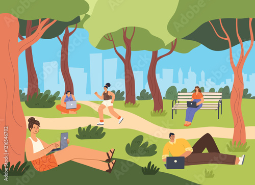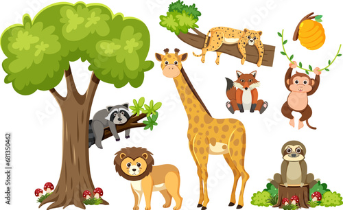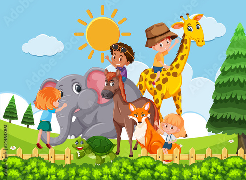 Zoo animals vector flat style design illustration. Happy family feeding carrots to baby giraffe.