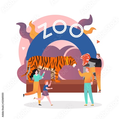 Zoo entrance gate, man feeding tiger with meat and visitors happy family father mother and son, vector illustration. Zoo park composition for web banner, website page etc.
