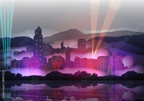 Glowing neon cinema festival poster or banner background. Colorful 3d style movie camera with film spotlight. Sale cinema theatre tickets, movie time and entertainment concept. Vector EPS 10