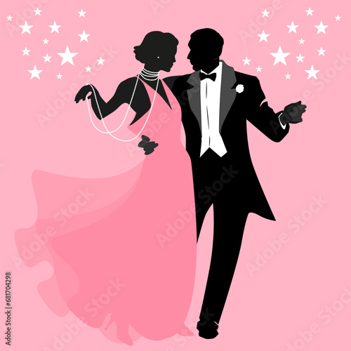 Elegant dancers couple silhouettes dancing in retro fashion style. Broadway dance style.