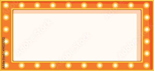 Orange empty rectangular vintage wall sign with light bulbs is shining, inviting you to write your message
