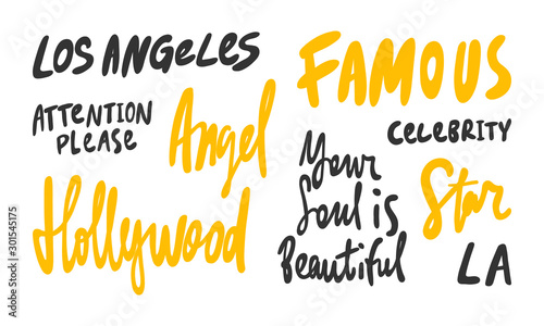 Famous, Los Angeles, Angel, Soul, Beautiful, LA, Star, Hollywood, Celebrity. Vector hand drawn illustration collection set with cartoon lettering.