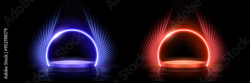 Blue and red award podiums for winner ceremony or product presentation vector illustration set. Abstract empty prize platforms with neon glowing round frame, rays, glitter confetti sparkle rain.