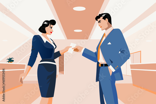 Wymiana wizytówek między dwojgiem profesjonalistów w biurze. Ilustracja w stylu retro, symbolizująca nawiązywanie kontaktów i współpracę.