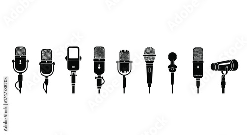 Microphone Set Silhouette Vector Illustration	. group of microphone design black and white