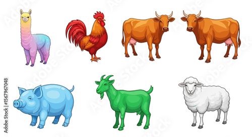 Vector farm animals vector illustration featuring llama, rooster, cow, pig, goat, and sheep cartoon clip art