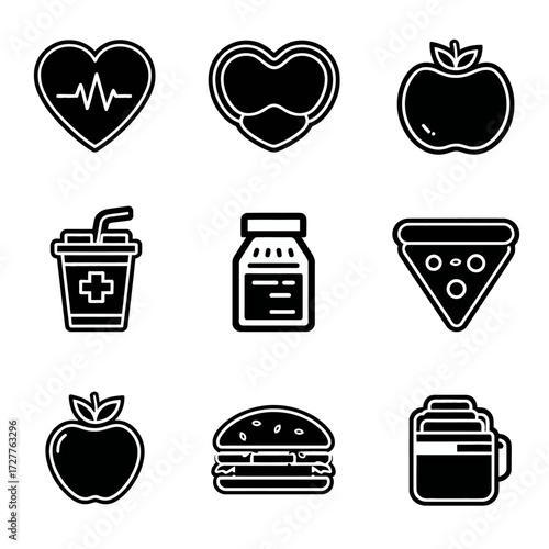 Various icons include fruits, fast food, medicine, soda, and heart symbols