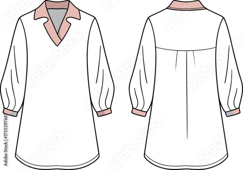 Flat sketch of women’s long sleeve tunic dress with high neck, front and back view, fashion technical design illustration