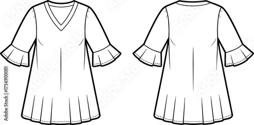 V-neck ruffle hem tunic dress sketch, drawstring waist, puff sleeve, front and back view, CAD drawing vector template