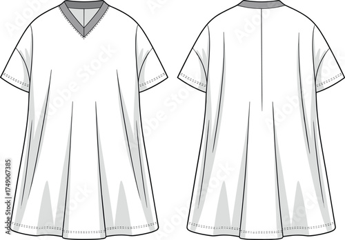 Technical fashion flat sketch, tunic dress front and back view, three-quarter sleeve, round neckline, minimalist garment design, apparel illustration, vector template