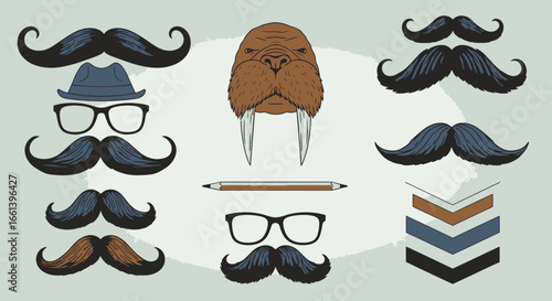 A collection of diverse human figures, a mustache icon, and an animal scene illustration.
