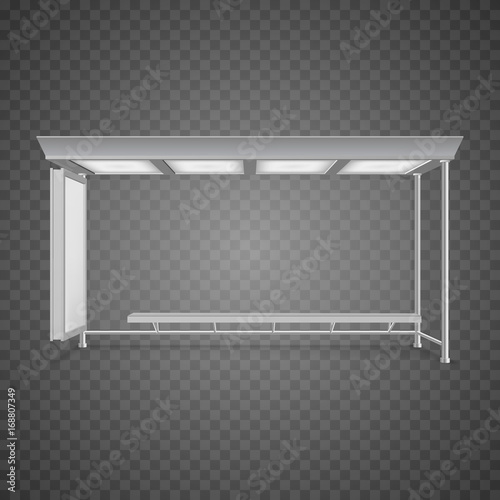 Empty bus stop. Waiting station with bench, traffic map, bus sign and trash bin. Modern design element for urban infographic. Flat vector illustration isolated on transparent.