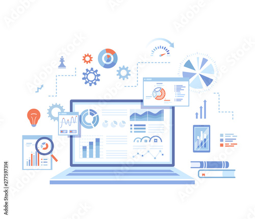 Flat design illustration showcasing digital marketing analytics and ecommerce trends with laptop