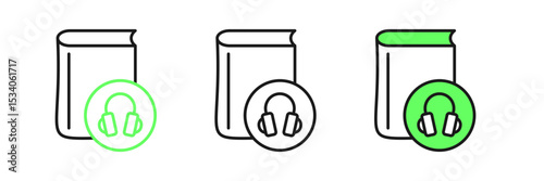 Book with Headphones icon set in outline, dark mode, and color styles. Perfect for audiobook, podcast, online reading, or digital library concepts in modern vector design.