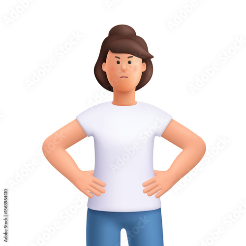 Serious woman Jane standing with her hands on her hips and an angry or frustrated facial expression. Displeased, conveying, confrontation. 3d vector people character. Cartoon minimal style.