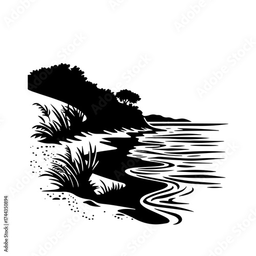 River bank landscape silhouette — winding water edge with bushes and cliff, nature scenery vector illustration