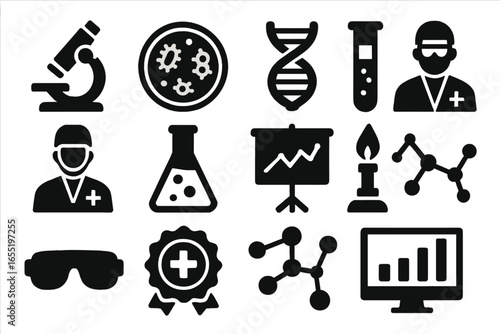 Vector art of set of science and medical research icons isolated on white background