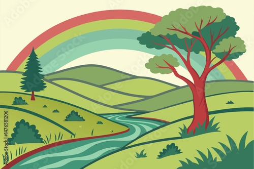 A simple paper cut illustration of a family near a tree and houses