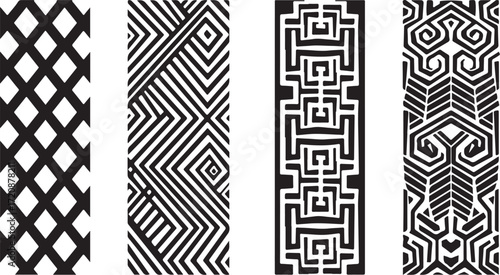 Set of four vector geometric tile designs with intricate modular patterns, including circles and squares. Black and white line art template for architecture.