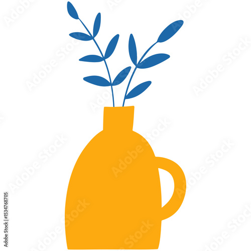 Textured dark blue vase with a plant branch isolated on a white background. Vector element mid-century modern style muted tones