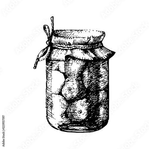 Jam jar illustration featuring rustic jar, closed with checkered fabric on transparent background. Jam jar drawing depicts fruit preserve in vintage container, offering traditional homemade goodness.