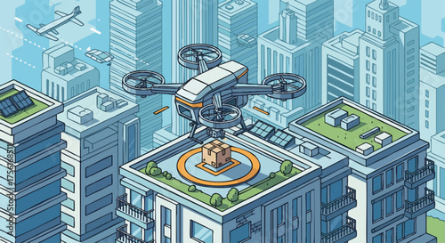 Isometric vector illustration of a delivery drone dropping a package. Futuristic logistics and shipping concept in a smart city. Autonomous aerial vehicle on a skyscraper rooftop