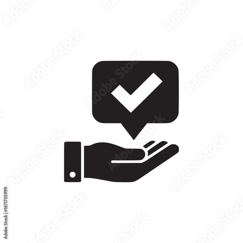 A hand holding a speech bubble with a check mark inside in black and white vector illustration