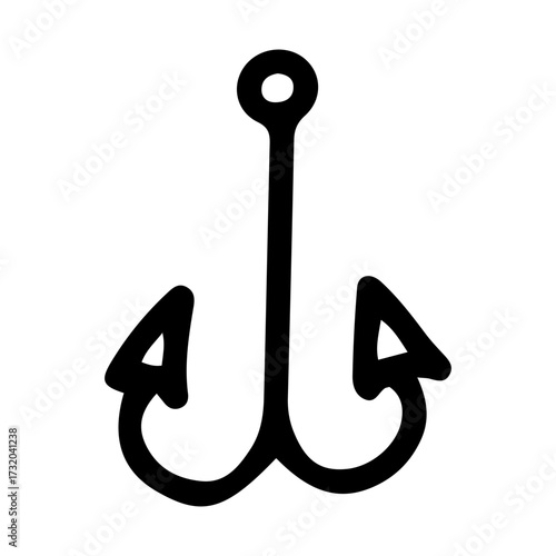 Fishing spoon with hooks. Hand drawn doodle vector. Spinning rod equipment. Wobbler, lure. Artificial fish. Seafood catch. Lake camping. Fishery tackle. Line art illustration.