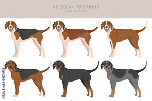 Trigg Hound puppy clipart. All coat colors set.  All dog breeds characteristics infographic