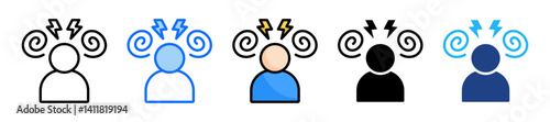 Visual representation of a person experiencing dizziness and vertigo with spinning stars and lightning bolts.