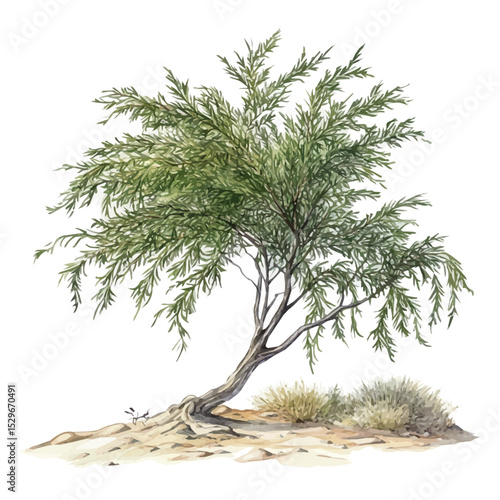 Watercolor painting of Tamarisk Tree, detailed and artistic vector illustration on a white background.