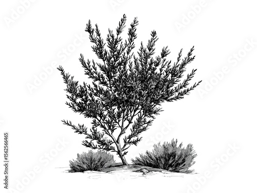 Tamarisk shrubs near a salt lake in a desert, Plant Illustration