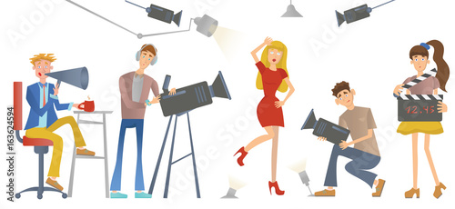 Movie production scene. Isolated film production people crew making movie. Film director man, actor person, camera operator shooting, lighting technician woman, sound designer vector illustration
