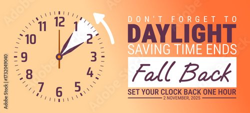 Fall Back. daylight saving time ends 2025 background or banner design template. Daylight Saving Time is Over. The clock turns back one hour on November 2, 2025. Fall back concept banner. Vector