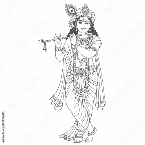 Lord Krishna Playing Flute: Detailed Line Art Illustration