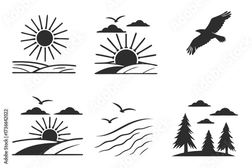 vector solid black filled icons hopefulness (sunrise beam): sun rays sky gradient bird flight open wings light haze shadow smear.