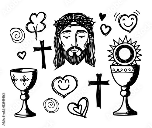 Line art illustrations of Christian communion symbols including chalices, hosts with crosses, and other religious emblems.