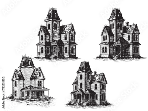 Halloween Haunted House Silhouette Bats Skeleton Witch Pumpkins Graveyard