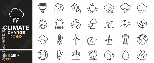 Environment Editable Line Icons Set with 30 Symbols Keywords: environment, nature, ecology, sustainability, conservation, earth, sun, water, fish