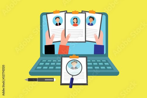 Recruitment of personnel.People use a computer to study applicants' questionnaires..Poster in business style.Flat vector illustration.