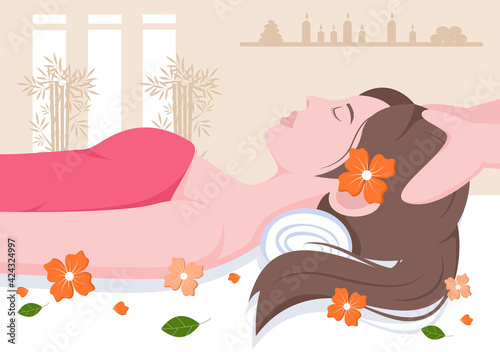 Young woman enjoying wellness SPA physiotherapy. Cupping treatment SPA as vacuum therapy. Alternative medicine and acupressure rehabilitation method for wellness, recreation. Vector illustration