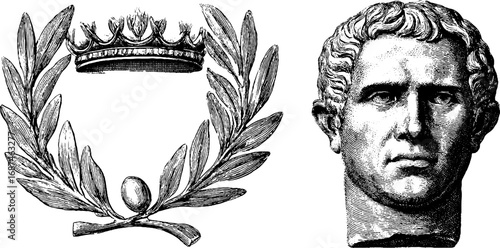 Engraved marble bust classical male figure curly hair vintage sketch hand drawn engraving illustration. Antique sculpture art with detailed roman portrait and elegant historical aesthetics.