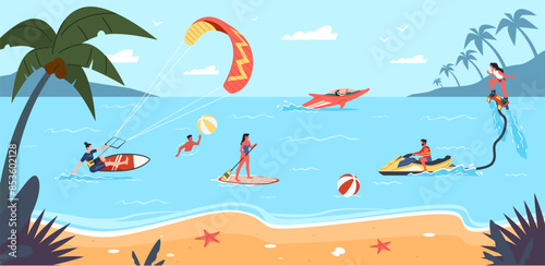 Set of water sport. Collection of people riding various water equipment. Tropical lifestyle. Riding on the waves. Leisure. Color illustration of an active sport.