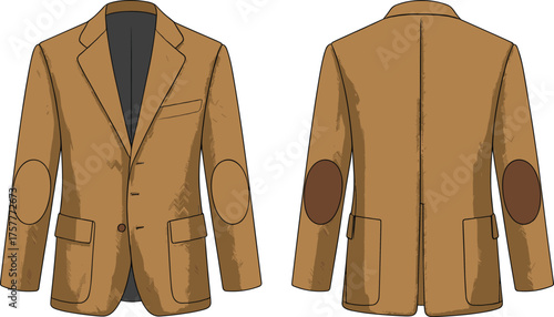 Tailored blazer technical flat, fashion sketch vector, front back view, notched lapel, flap pockets, sleeve buttons, garment design drawing