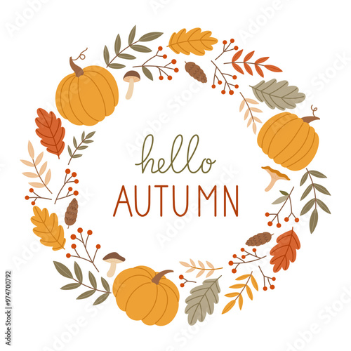 Hello autumn circular frame with colorful fall plants and leaves Greeting card